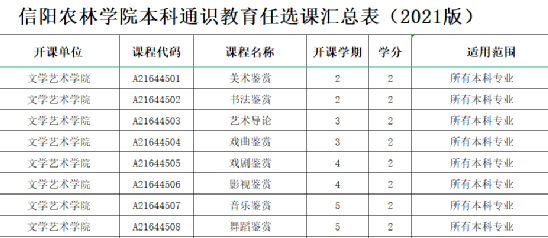公选课中包含艺术类限选课,学生在校期间至少修读2学分,共开设有8门(见下表),均为线下课程,开设学期为2-5学期。