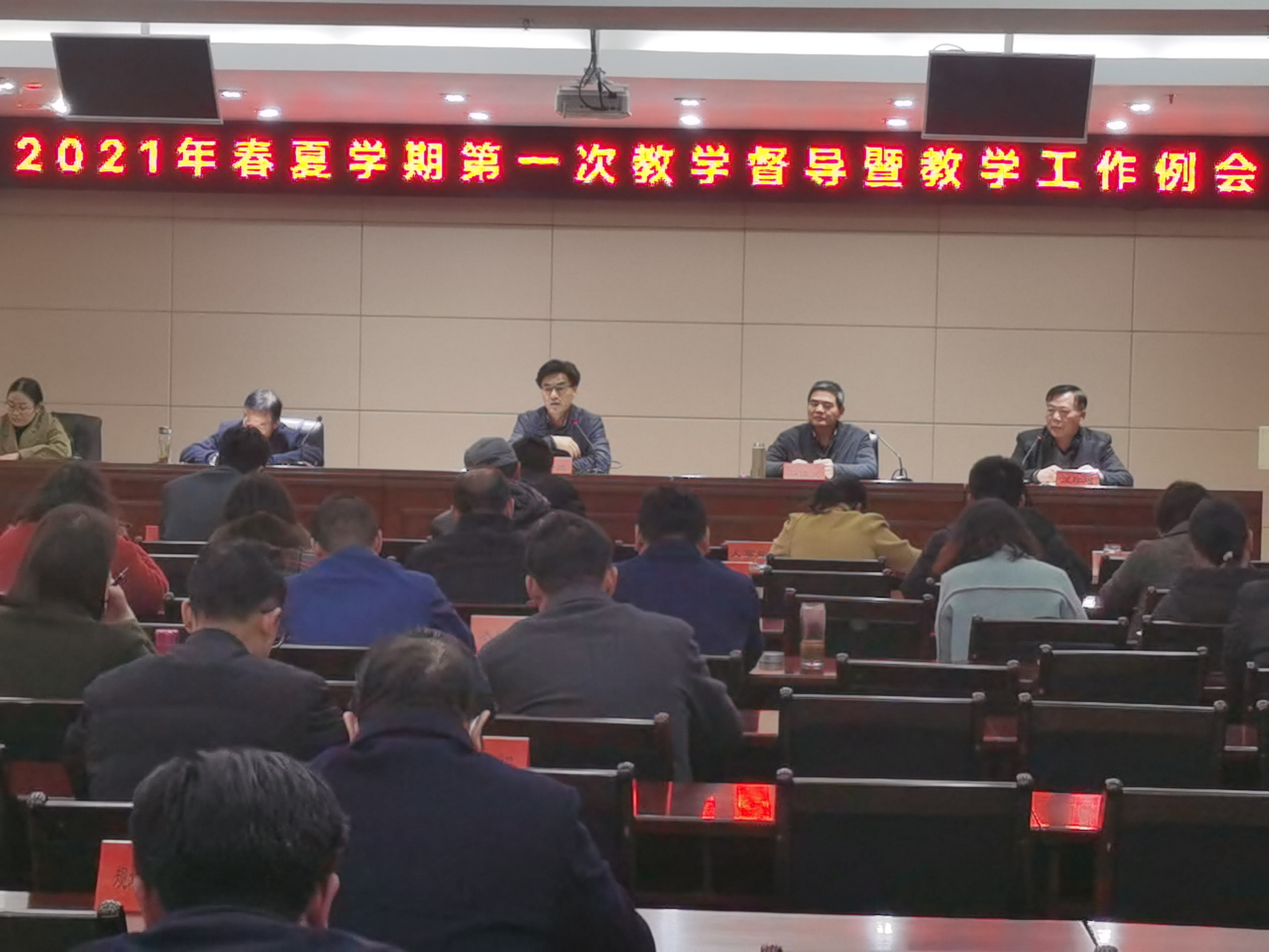 35日,学校召开新学期次教学督导暨教学工作例会。会议先后听取了校教学督导团、教学质量与监控中心、教务处关于上学期工作汇报及新学期的工作计划。学校副校长赵一鹏出席会议并讲话,教务处处长王学增主持会议,各学院、人事处、学生处、后勤管理处、创新创业中心、教学督导团参加会议。