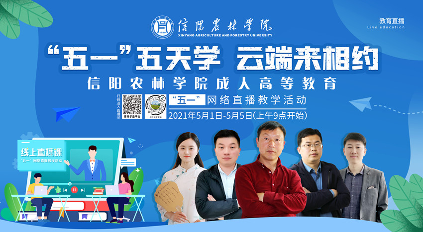 该校继续教育学院副院长岳宝华介绍,本次教学活动是根据教学计划和学生的实际情况确定的,“五一”期间每天邀请一位老师直播授课,教学内容包括:党史学习教育内容《不忘初心 牢记使命——学习中国共产党百年辉煌史》、传承红色基因内容《学习弘扬大别山精神,争做新时代奋斗者》、现代农业趋势《农业绿色发展路径》、信息技术内容《互联网+农业》、茶文化与茶艺《人在草木间,趣品茶韵》。