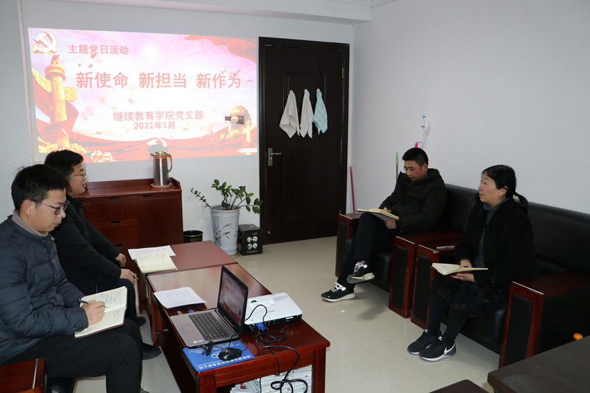 1月12日,继续教育学院党支部在综合楼311房间开展了以“新使命·新担当·新作为”为主题的党日活动。全体党员参加,活动由支部书记黄艳霞主持。
