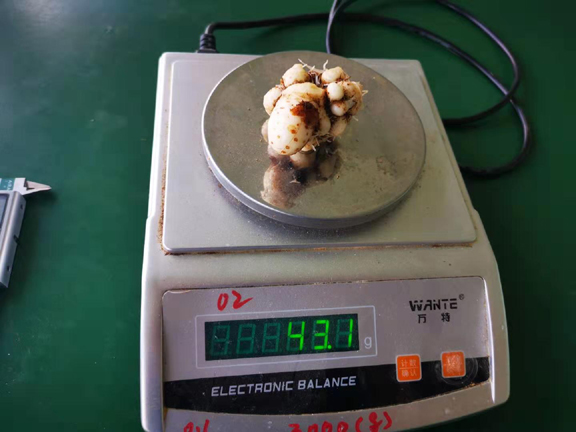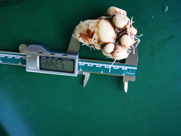 8月31日下午,服务团应半夏种植户的要求,前往息县尹湾村半夏种植基地查看半夏倒苗后的生长情况。此处半夏种植基地是今年初次种植,亩下种仅50kg,全部施用农家肥,半夏生长态势良好,半夏球茎整体偏大,除去须根直径达53.44mm,重达43.1g。