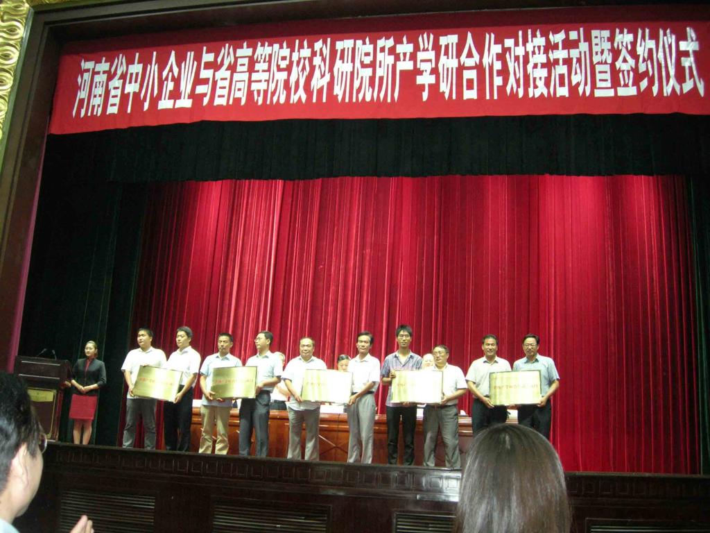 省工信厅、省教育厅、省科技厅于8月26日在郑州举办了全省中小企业与省高等院校、科研院所产学研合作对接活动暨签约和“省级产学研合作试点项目”授牌仪式。魏明奎、孙耀清、李大明和科学技术处史洪中参加了活动。(科学技术处)