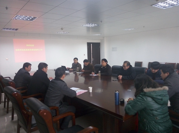 20151216日下午,信阳市科技局副局长、市知识产权局局长金世明、老干科科长李明晓、知识产权局涂小东科长一行三人来beat365在线平台官网检查2014年信阳市科技计划项目实施进展情况及新申报的市级工程技术中心筹建情况。