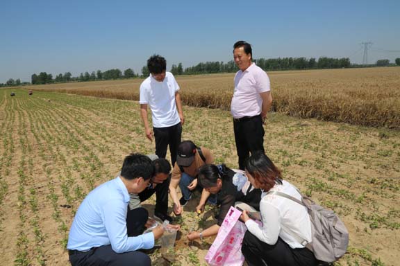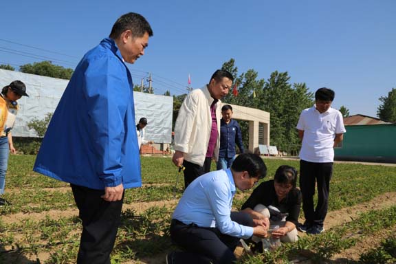 接着,服务团到长陵乡陆湾村息半夏种植基地,再次查看息半夏生长态势,此处的半夏田地原先种植花生,土壤中白绢病菌多,加上肥力不足、高温干旱,导致半夏叶片枯萎死亡、根部球茎腐烂等问题,服务团建议采用滴灌系统,采用水肥药一体化,结合植物免疫剂,保证半夏健康生长。