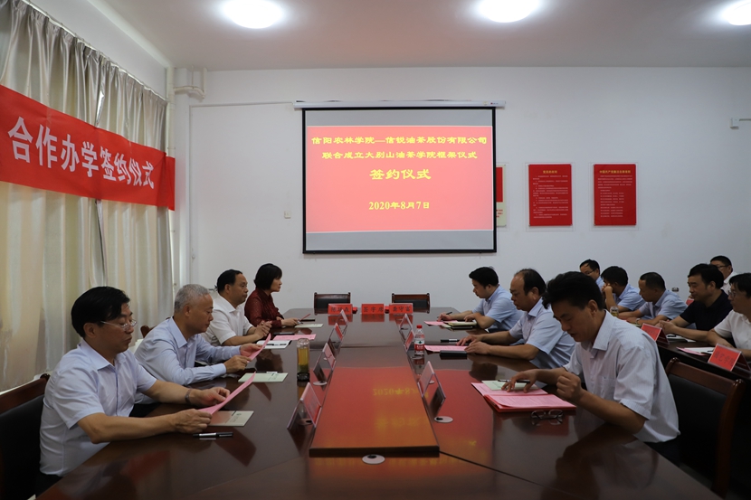 8月7日上午,大别山油茶学院签约暨揭牌仪式在园艺学院举行。信阳市人大常委会副主任陈延虎,副市长胡亚才,市政协副主席、工商联主席陈豫,校长邢勇,副校长赵一鹏,信锐油茶股份有限公司董事长熊维政,市林茶局、市农业农村局、市农科院、市林科所和beat365在线平台官网林学院、食品学院的负责同志、专家及园艺学院教师代表参加了签约揭牌仪式。仪式由赵一鹏主持。