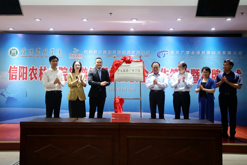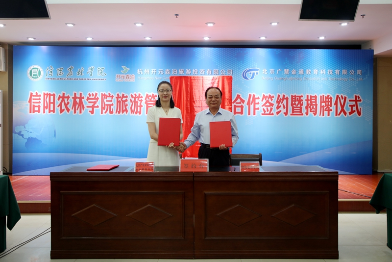 为深入推进产教融合,实现产学研协同育人,5月10日上午,旅游管理学院与杭州开元森泊旅游投资有限公司、北京广慧金通教育科技有限公司校企合作签约暨揭牌仪式在综合楼一楼会议室举行。校长邢勇,副校长赵聘,信阳市文化广电和旅游局党组成员、副局长滕小玉,杭州开元森泊旅游投资有限公司副总经理李飞若、总经理助理兼人力资源总监陈静,北京广慧金通教育科技有限公司常务副总付晓军、副总兼合作发展部总经理王文婷、合作发展部项目经理王栗媛,科学技术处和旅游管理学院负责同志等参加签约揭牌仪式。仪式由赵聘主持。