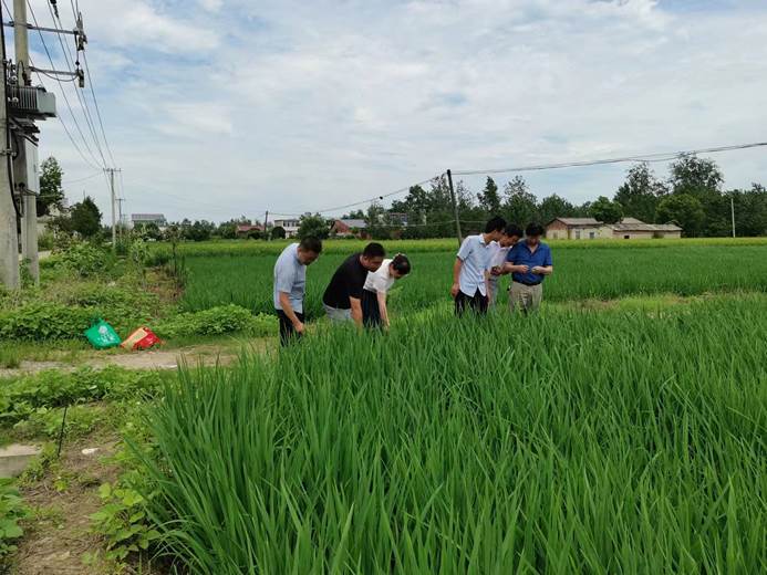 在光山县孙铁铺镇郑堂村的盛世源农机专业合作社,科技特派员一行查看了机械化插秧种植的优质粳稻“宁香粳9号”示范田,前期合作社在科技特员建议下使用噻虫嗪防治稻蓟马后,水稻分蘖发生良好。但由于前期连阴雨天气频发,雨水较多,接下来在水稻拔节至孕穗期,科技特派员建议要注意观察和防治水稻纹枯病等,对于群体过大的田块,可使用三环唑·井冈霉素、肟菌酯·戊唑醇等进行喷施,预防并防治纹枯病和稻瘟病的发生。(撰稿/农学院 季新 刘秋员)