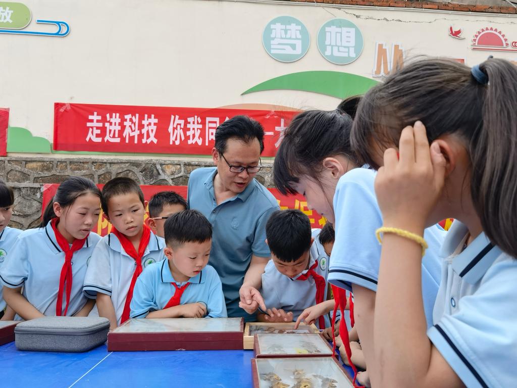 在昆虫标本教学课堂上,吸引了大量学生们的围观。潘鹏亮老师生动地讲解,让学生们见识到大自然的鬼斧神工,千奇百怪的昆虫种类激发了学生们的好奇心和学习的兴趣,让学生们开阔了眼界,增长了知识,增强了他们对科学技术的向往,满足了他们探索的热情。随后,进行的无人机表演,更是将此次活动推向高潮。王国君老师展示了无人机的飞行特点及在农业等领域的应用,让学生们充分领略了科技的奥秘与神奇。小学生们从小对无人机、对飞行感兴趣,把科技创新思维从小植入学生们的脑海中,也真正体会到科学带来的快乐和科技的神奇魅力。