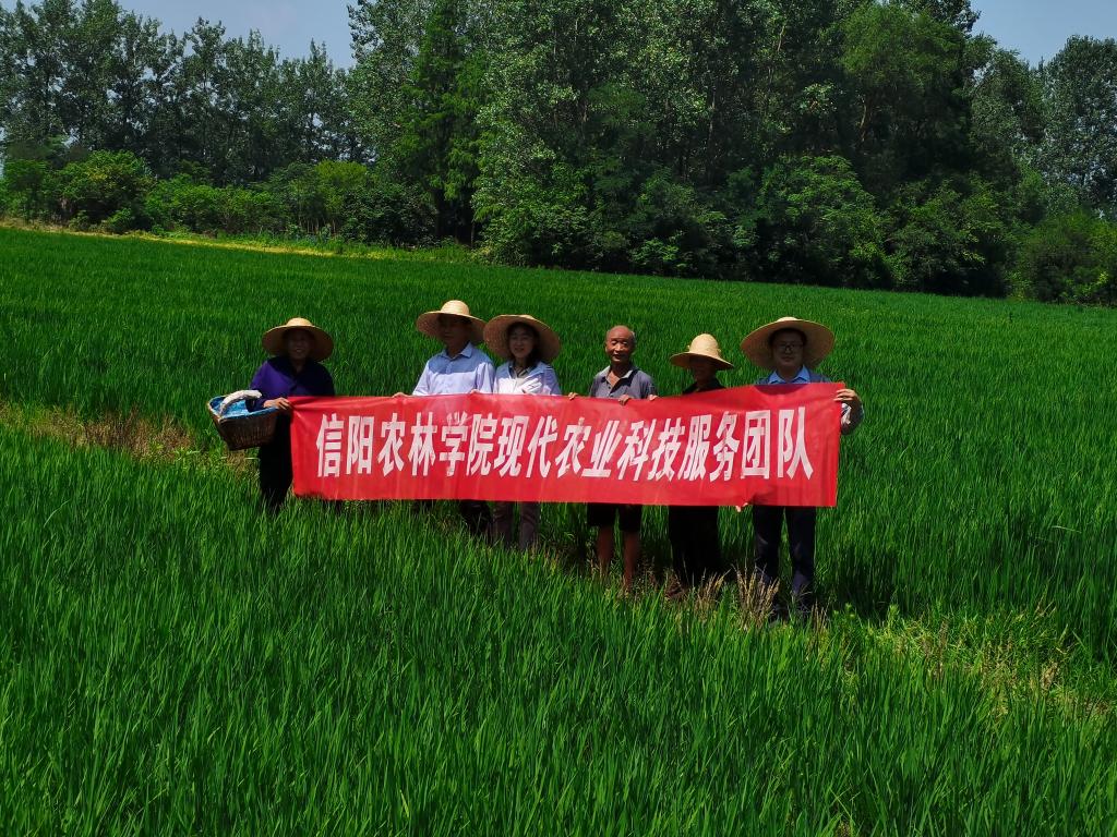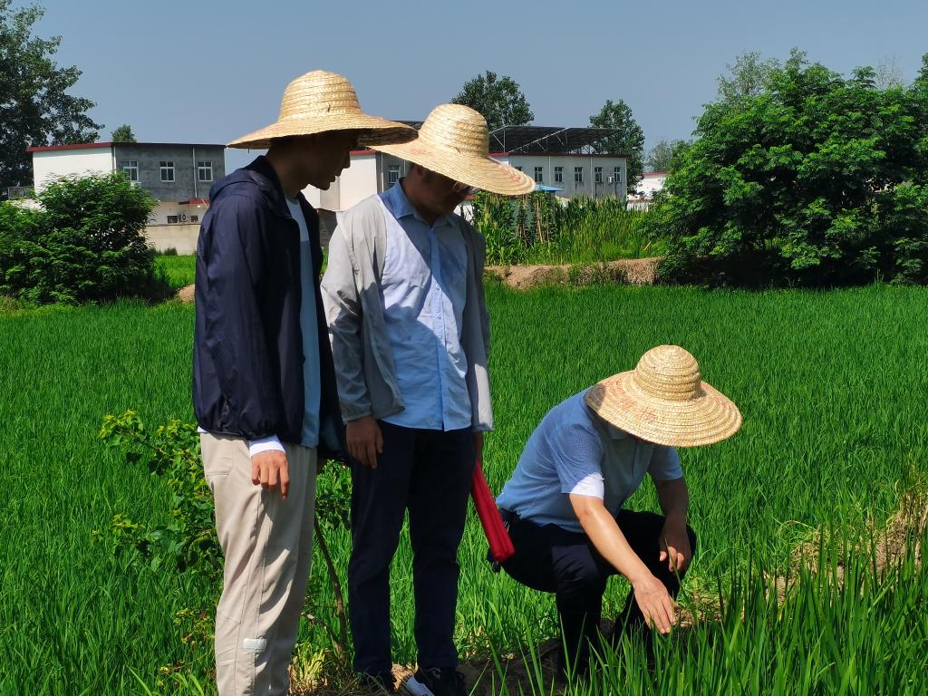 2022年6月29日,beat365在线平台官网现代农业科技服务团成员董丽平、鲁伟林、季新及农学院教师曹永润博士到信阳市甘岸镇繁高农业种植专业合作社水稻基地开展科技服务。