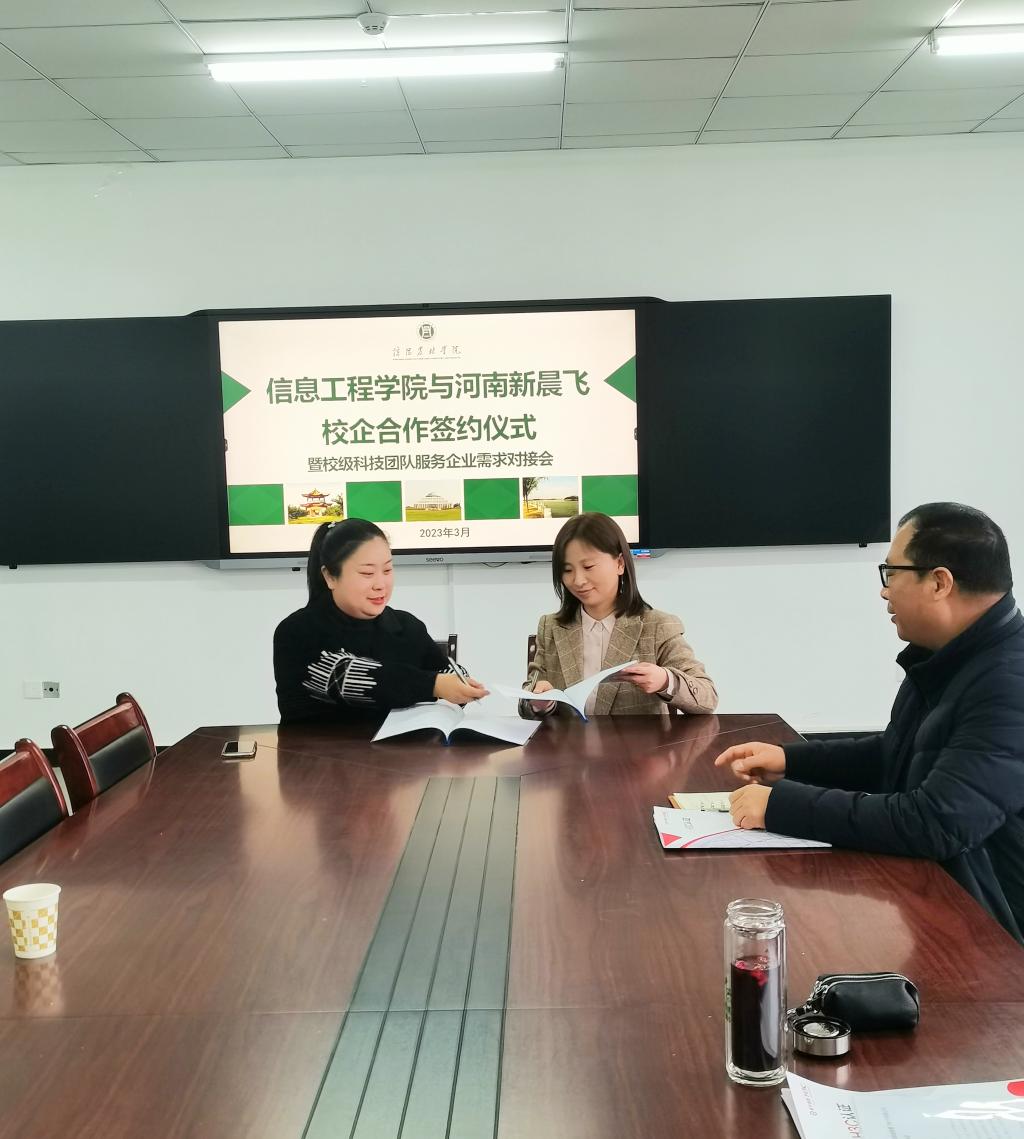 3月17日上午10点,在双创615信息工程学院和河南新晨飞电子有限公司举办校企合作签约仪式,仪式结束后,学院工业物联网、数字软件科技服务团队,“云·智农”科技创新团队项目主持人和企业代表进行了科技服务需求对接。