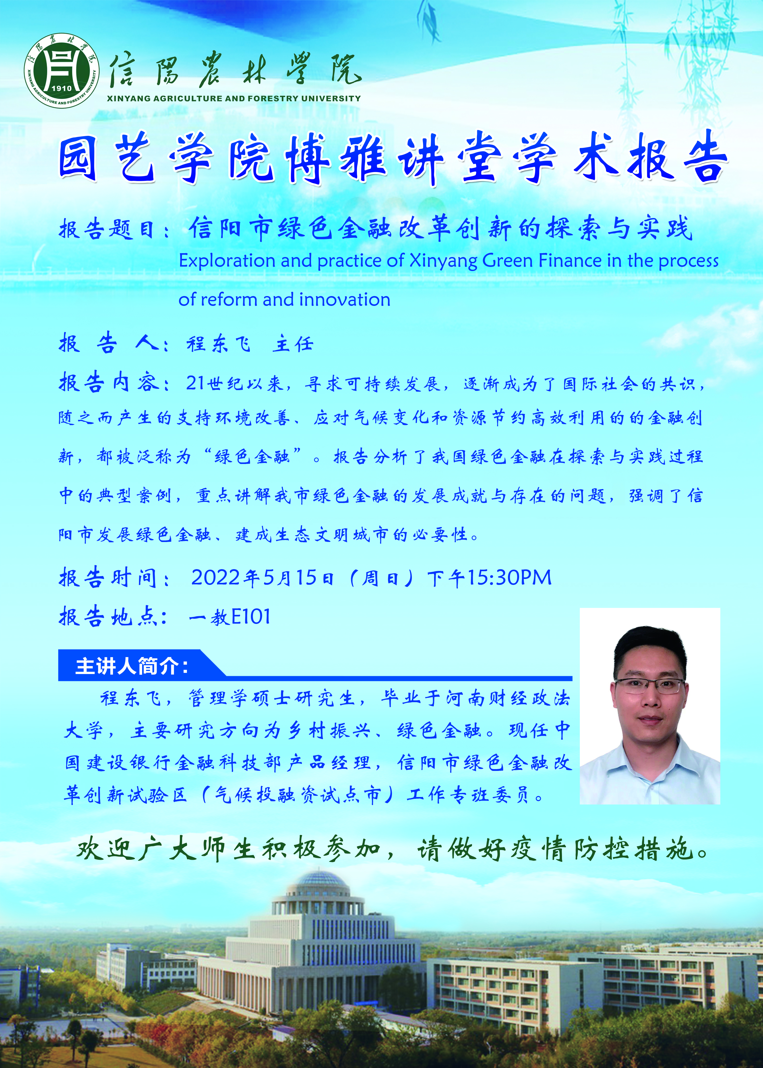 为了贯彻落实学校科研氛围营造年活动要求,按照园艺学院科研氛围营造年工作部署,学院邀请了中国建设银行金融科技部产品经理、信阳市绿色金融改革创新试验区(气候投融资试点市)工作专班委员程东飞到我院做博雅讲堂学术报告,现将有关事宜通知如下: