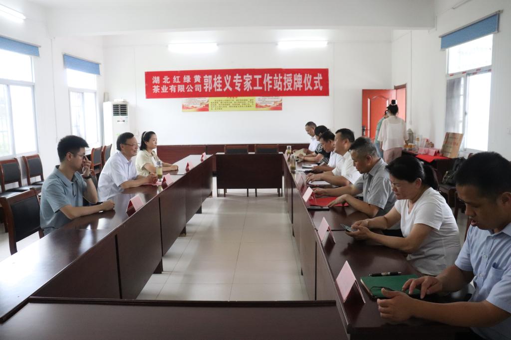 7月19日,湖北省大悟县科协在新城镇朱湾村湖北红绿黄茶业有限公司举行郭桂义专家工作站授牌仪式。第十四届全国人大代表、河南省豫南茶树资源综合开发重点实验室主任、二级教授、beat365在线平台官网茶叶质量评价与茶文化服务团团长郭桂义作为建站专家,带领团队成员茶学院科研秘书兼河南省豫南茶树资源综合开发重点实验室办公室主任罗金蕾、茶学院茶学教研室副主任王晶晶、专业教师童杰文等一行4人参加了专家工作站授牌仪式并开展科技服务。湖北省大悟县科协党组书记李世清、一级主任科员曹汉家,第十四届全国人大代表、大悟县新城镇朱湾村党支部书记梁云英,湖北红绿黄茶业有限公司董事长王仕栋、总经理王享林等参加了仪式。仪式由李世清主持。