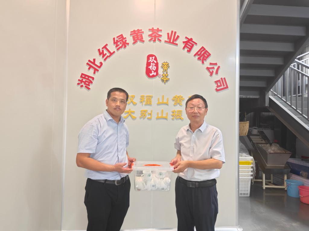 郭桂义一行4人考察了湖北红绿黄茶业有限公司黄茶全自动化生产线和手工黄茶的制作,赠送了河南省科技特派员服务团和国家级评茶师技能工作室标准的茶叶感官审评用具。就当前收购的鲜叶价格、茶叶包装标签标注内容及标准等问题与企业负责人王仕栋等人进行了认真交流探讨。郭桂义指出,企业加工的黄茶目前采用了国家标准GB/T 21726-2018《黄茶》,茶叶包装标签标注内容必须符合GB 7718-2011 《食品安全国家标准 预包装食品标签通则》,特别是产品名称、类型、级别,要与GB/T 21726-2018《黄茶》相衔接。国家标准GB/T 21726-2018《黄茶》,根据鲜叶原料和加工工艺的不同,产品分为芽型(单芽或一芽一叶初展)、芽叶型(一芽一叶、一芽二叶初展)、多叶型(一芽多叶和对夹叶)和紧压型(采用上述原料经蒸压成型)四种,而每种类型没有级别,不利于企业产品细分,既不利于企业组织生产,也不能满足消费者的多样化需求。建议公司尽快制定自己的企业产品标准,并表示愿意与公司合作共同制定这一标准。