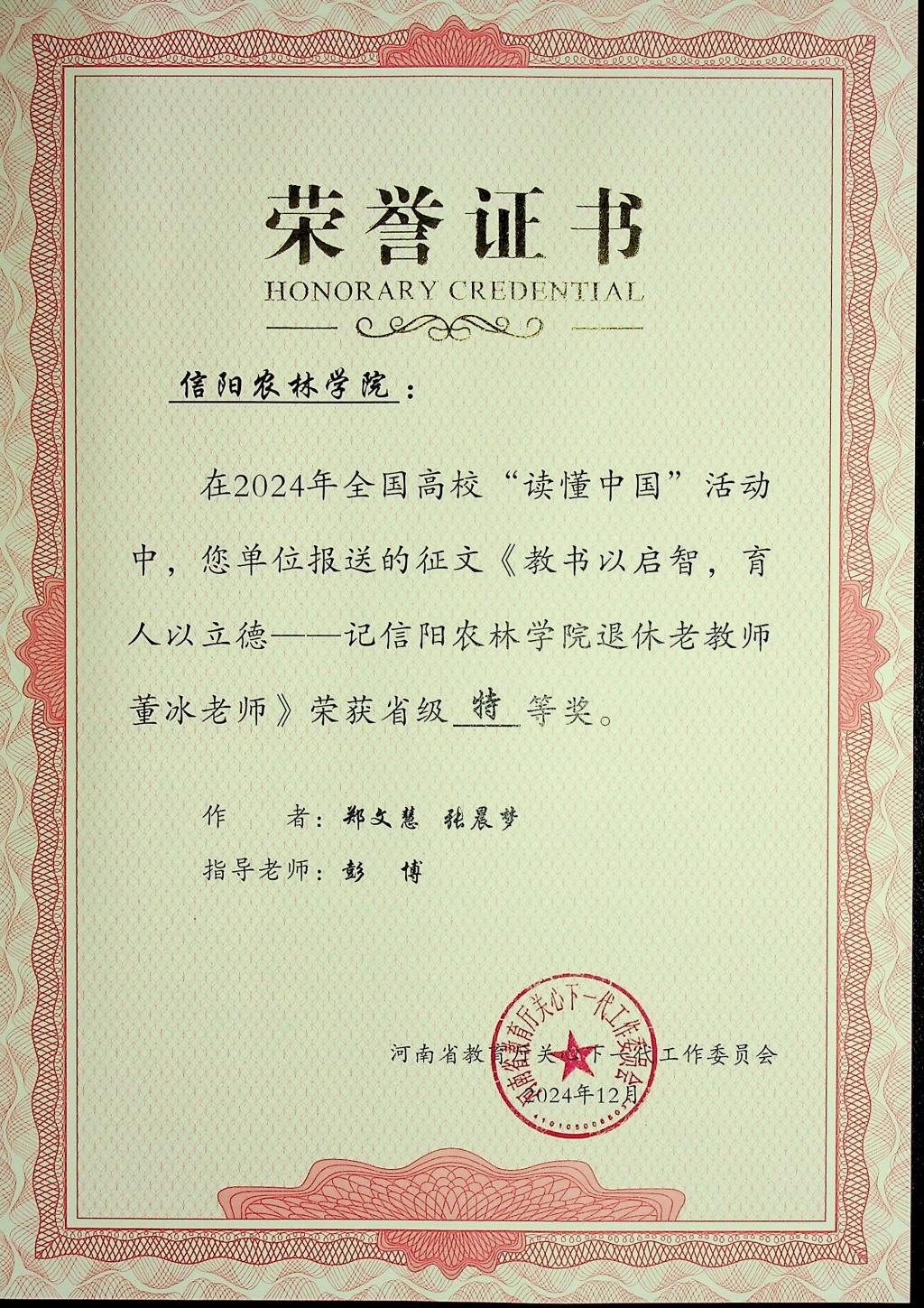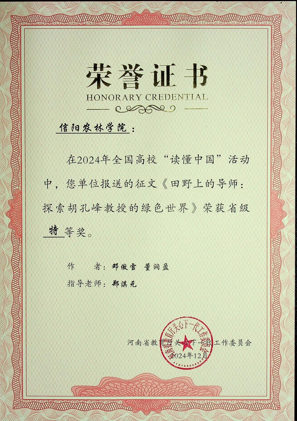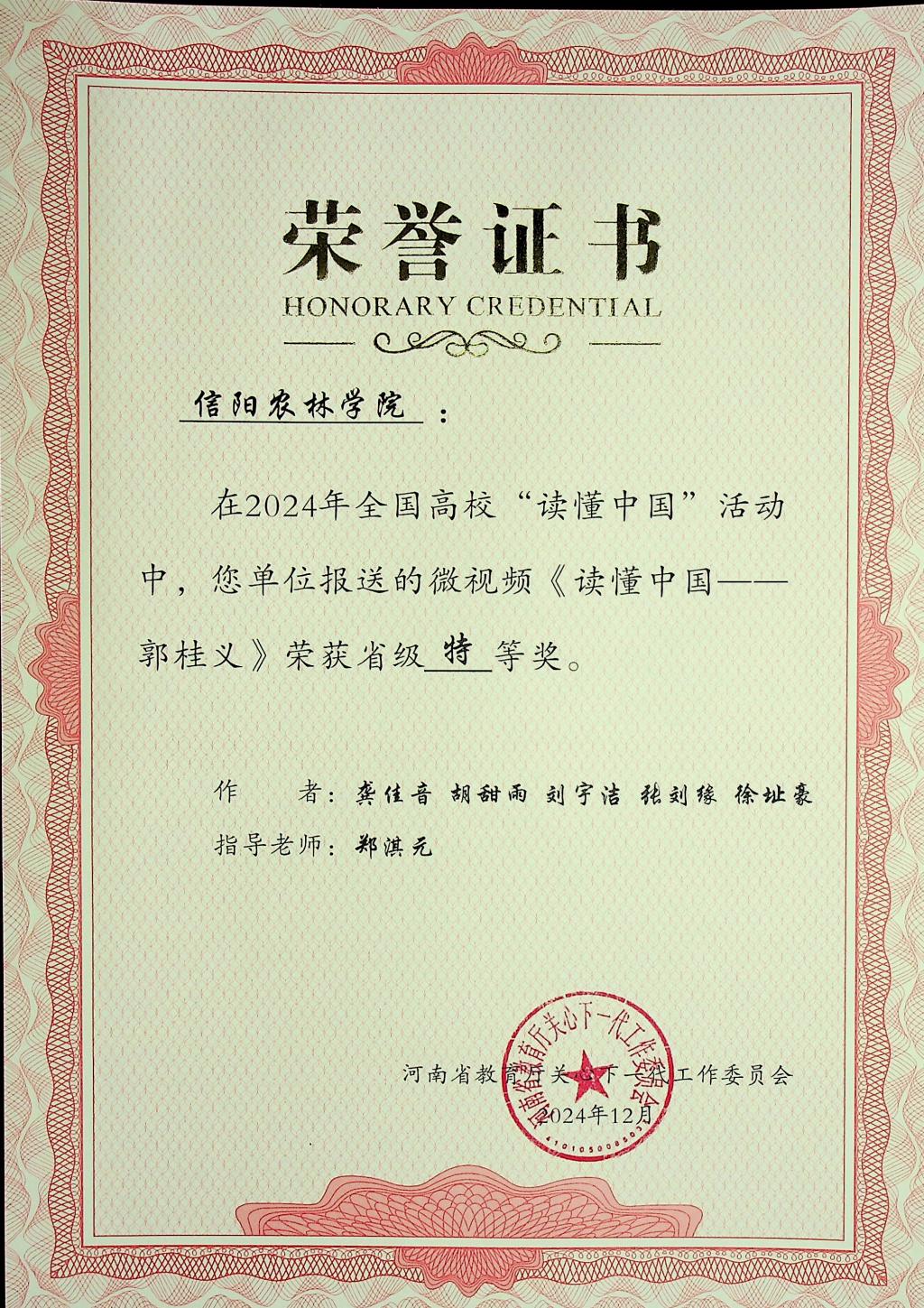 近日,河南省教育厅关工委公布了2024年全省高校“读懂中国”活动评审结果。beat365在线平台官网报送的5篇征文和两个微视频作品全部获奖,其中,3篇征文作品《郭桂义——茶香馥郁数十载,一片丹心化春泥》《田野上的导师:探索胡孔峰教授的绿色世界》《教书以启智,育人以立德——记beat365在线平台官网退休老教师董冰老师》获得特等奖,两篇征文作品《大爱者以德耕耘,教育者用心灌溉——梁本国》和《年虽耄老,不减“宏”鹄育人“智”—陈宏智》获得一等奖。微视频作品《读懂中国——郭桂义》和《读懂中国——胡孔峰》全部获得特等奖。