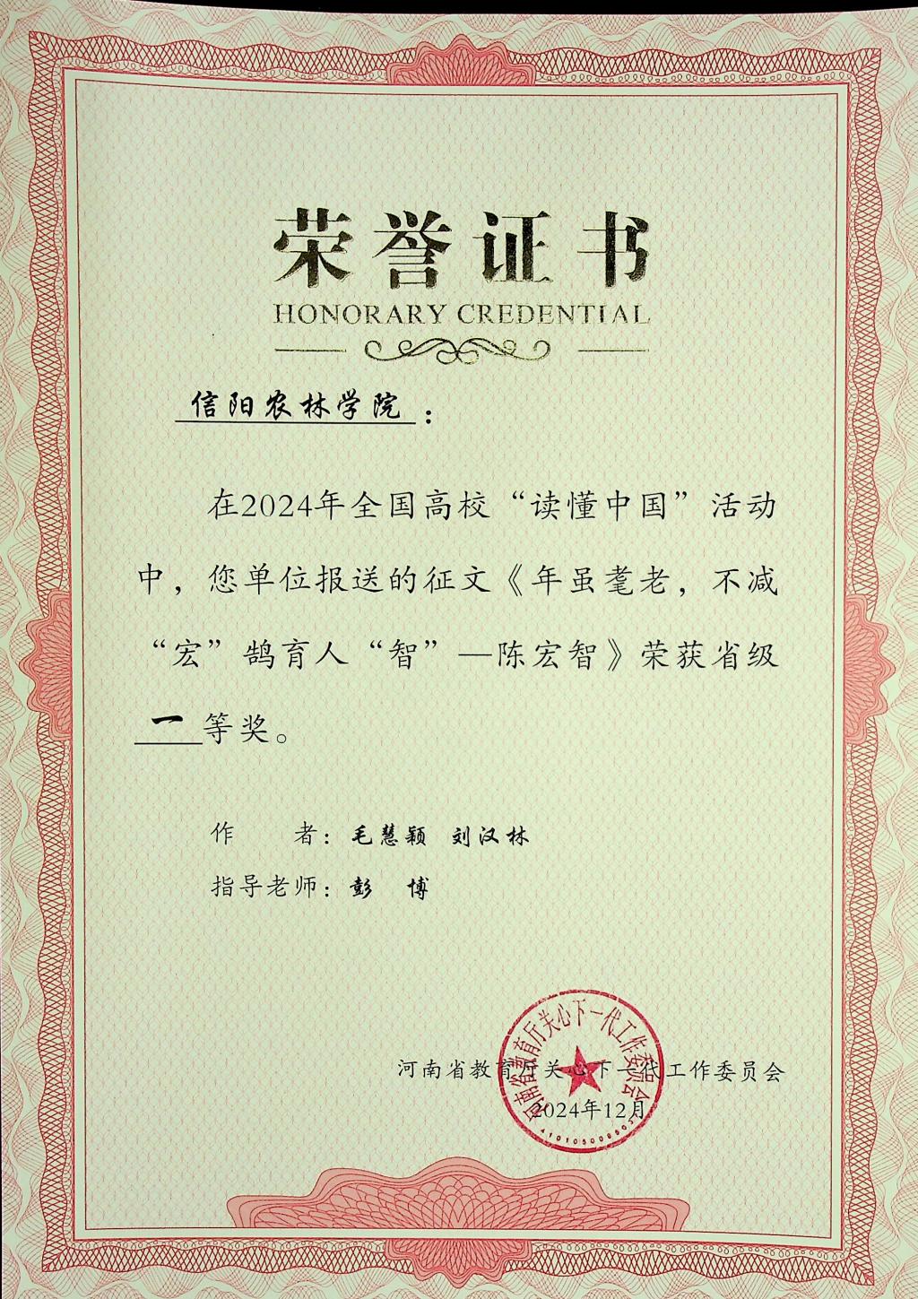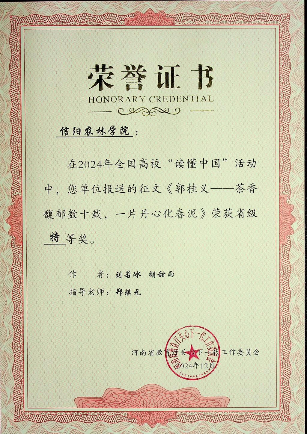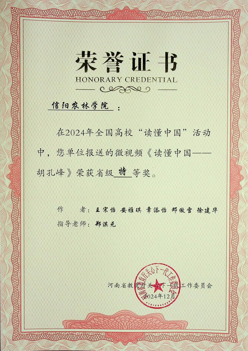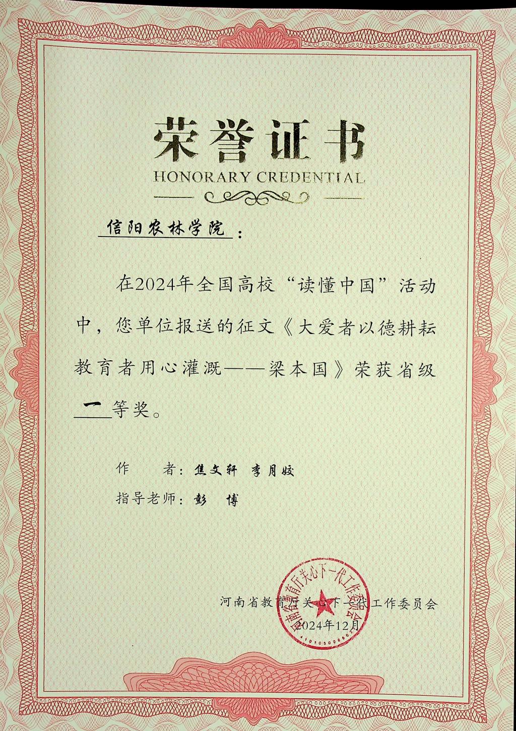 近日,河南省教育厅关工委公布了2024年全省高校“读懂中国”活动评审结果。beat365在线平台官网报送的5篇征文和两个微视频作品全部获奖,其中,3篇征文作品《郭桂义——茶香馥郁数十载,一片丹心化春泥》《田野上的导师:探索胡孔峰教授的绿色世界》《教书以启智,育人以立德——记beat365在线平台官网退休老教师董冰老师》获得特等奖,两篇征文作品《大爱者以德耕耘,教育者用心灌溉——梁本国》和《年虽耄老,不减“宏”鹄育人“智”—陈宏智》获得一等奖。微视频作品《读懂中国——郭桂义》和《读懂中国——胡孔峰》全部获得特等奖。