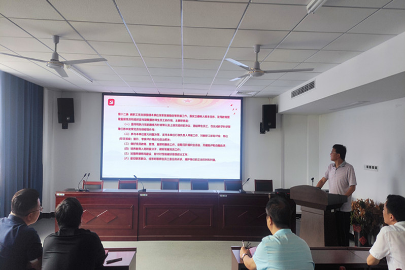 肖亮带领大家学习了《中国共产党普通高等学校基层组织工作条例》。围绕认真抓好基层党组织建设、加强对教工支部和学生党支部的思想政治引领、认真抓好各支部的“三会”实效性建设,以及会议组织程序、内容和会议记录等规范化建设,进行了认真学习。学习中,与各党支部书记和支委委员结合各党支部工作实际围绕立德树人根本任务,就“三会一课”和主题党日活动规范化开展进行了交流、解答。