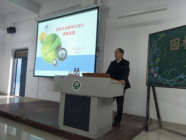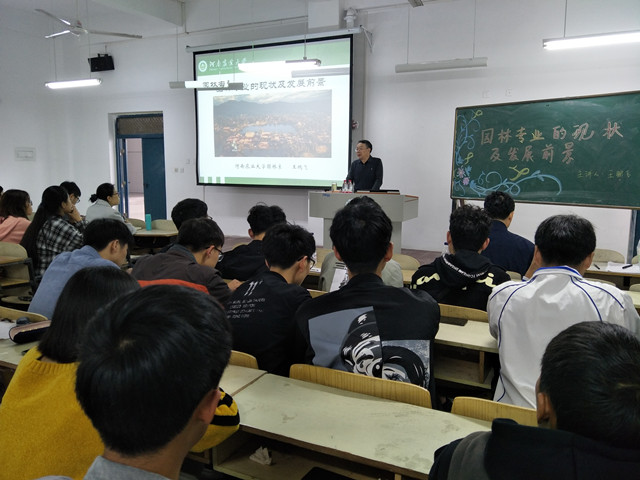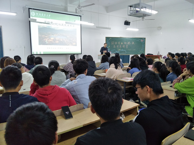 25日上午,河南农业大学园林系主任王鹏飞教授报告题目“园林专业的现状及发展前景”,林学院院长孙耀清教授主持,我院19级146名园林专业学生和园林专业教师参加。王教授从事风景园林与城乡规划专业的教学与研究工作多年,获河南省科技进步二等奖5项,出版专著7部,发表专业论文80余篇,主持规划设计项目60余项,指导的研究生获第六届(2016)“艾景奖”国际园林景观规划设计大赛金奖和2016“园冶杯”大学生国际竞赛二等奖。王老师的报告从“园林是什么、如何要建造人们满意的园林、园林专业的你将何去何从”三个问题深入浅出阐述园林专业的专业思想,王教授的报告既富有理论性,又通俗易懂,师生们都受益匪浅。