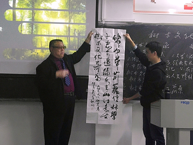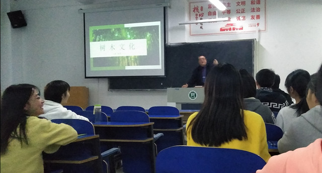 20191029日下午,应林学院邀请,一场别开生面的讲座在一教A104面向全院师生展开,开封市园林景观文化分会会长、南阳月季花文化大使、中国书法家协会会员、中国笔迹学会副会长林泉教授专程来校作了一场题为《树木文化》的专题报告讲座,报告会由林学院院长孙耀清教授主持。