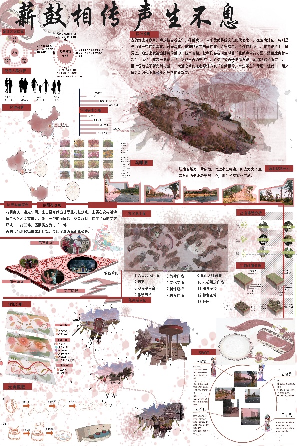 一周实训期间,指导教师从竞赛规则解读、相关案例分析入手,引导同学们拓宽设计思路,激发创新思维。通过分组讨论以及深入调研两种形式相结合,同学们针对河南当地的环境特色与文化内涵进行挖掘,将中国元素与场地设计相融合,精心绘制设计图纸。