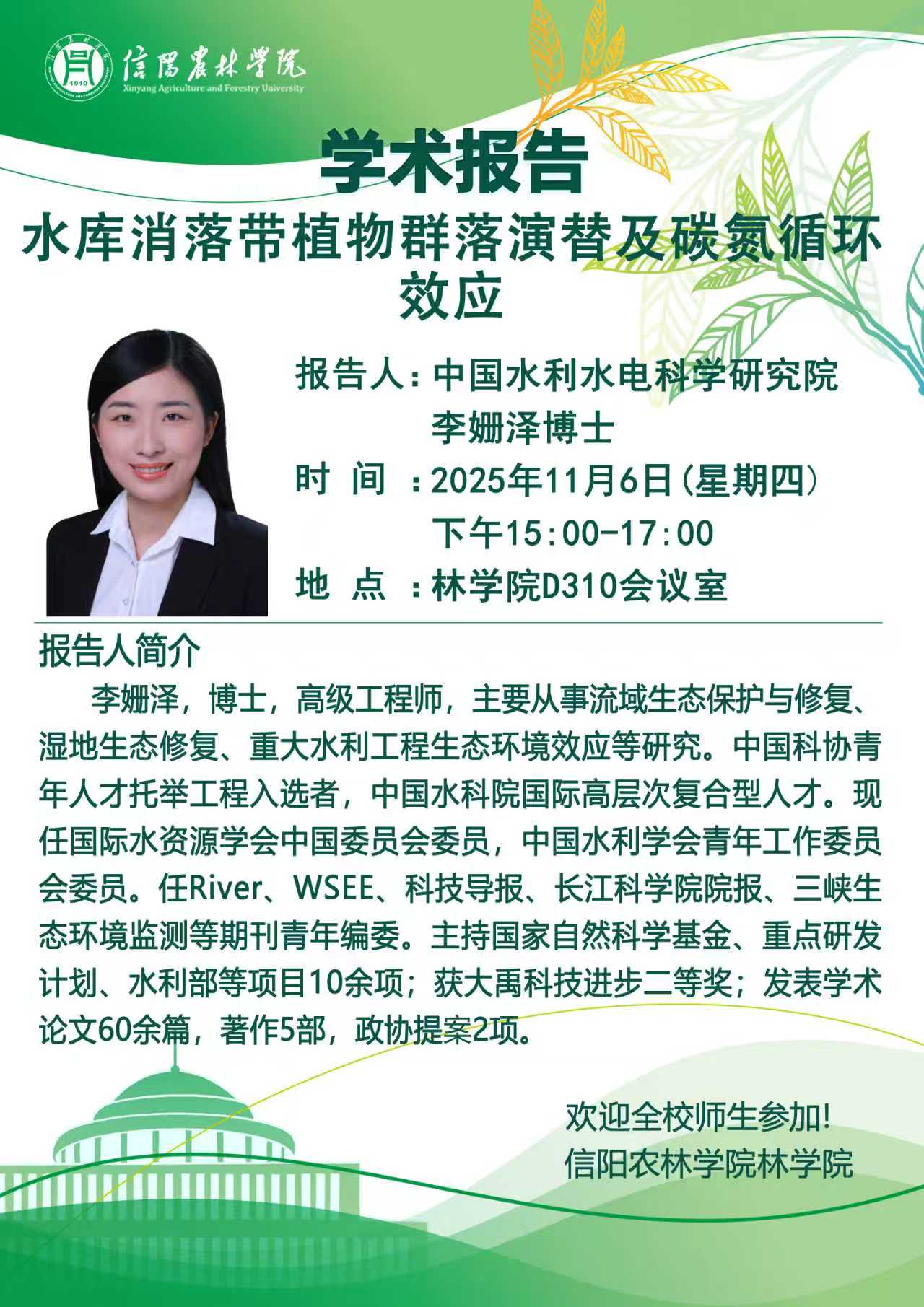 林学院“青山讲坛”系列学术报告:水库消落带植物群落演替及碳氮循环效应