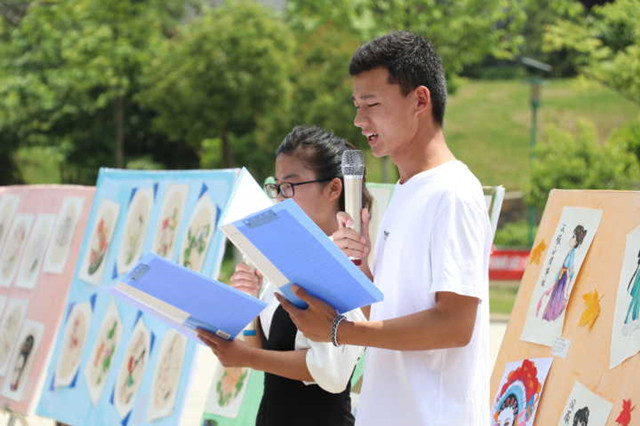 首先,由林学院团总支书记阎腾飞为本次书画展致开幕辞。他讲道,书画展已经成为林学院的一项传统活动。六年来,林学院师生求真、求美,书绘了大量的艺术作品,记录学校发展历程,讴歌新时代,共绘新中国。书画展的开展体现出林学院师生对于传统文化的美好追求,更是同学们对文化自信的由衷践行。随后,由林学院刘巧、张禾炫同学分别为大家带来歌曲《年轮》和《我的一个道姑朋友》,优美动听的旋律为现场观众营造了一个如诗如画的境界,收获了阵阵掌声。最后,在讲解员带领大家纷纷走向展板,去体会每幅画中的意境,走入艺术的世界。