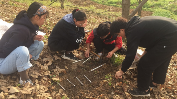 2021328日,林学院青年教师董楠带领“信农URP训练营”14名学生到十三里桥乡的小庙村开展茶园小气候的测定,试验主要是为了分析栗茶复合系统中板栗遮阴对茶叶产量和品质的影响。