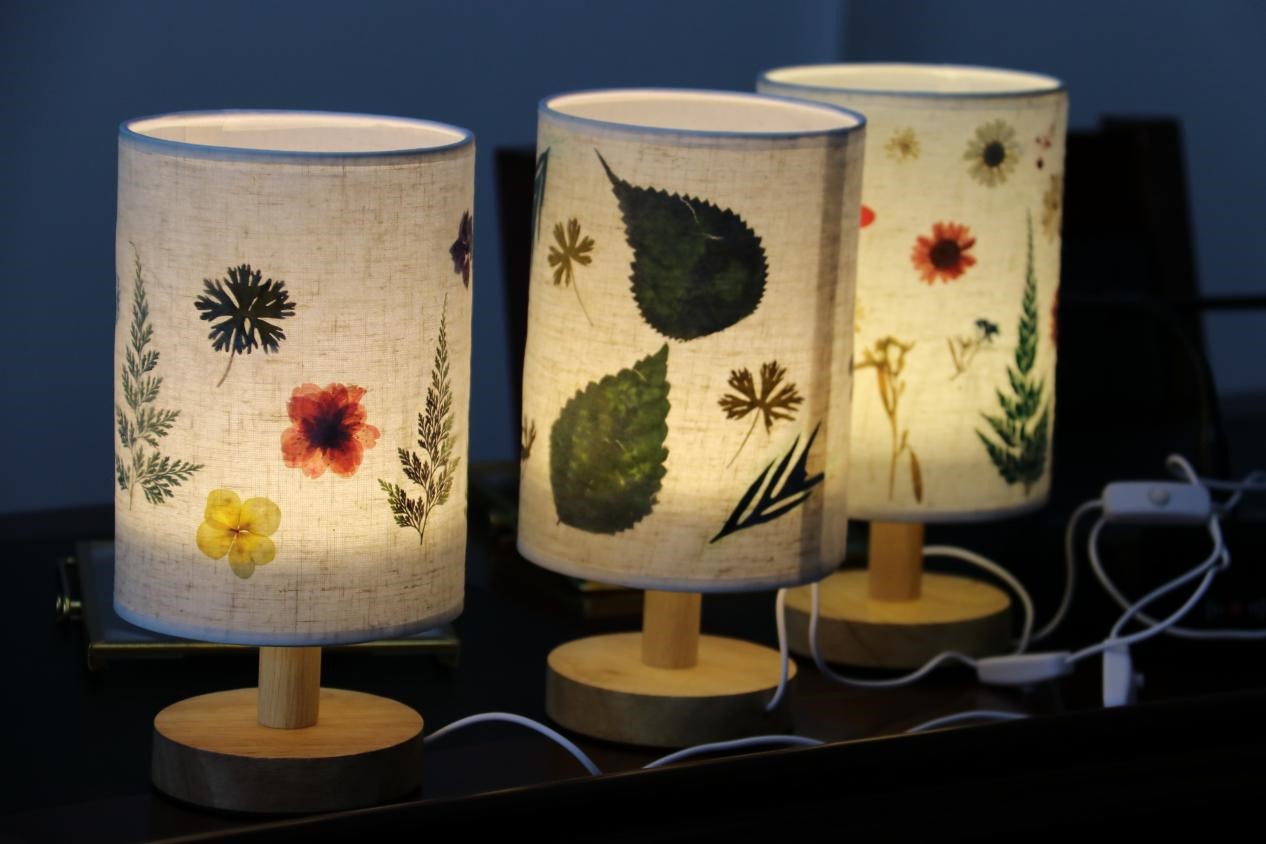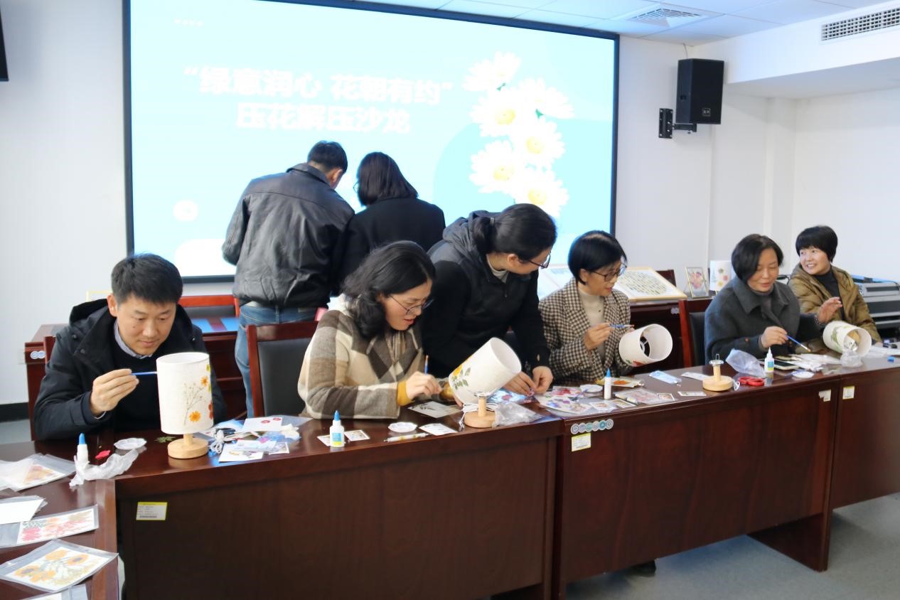 随后,王万玲一行与学生们一起作为学员参加学院“聆听”二级心理辅导站“绿意润心 花朝有约”压花解压沙龙。在了解了压花台灯制作的材料工具、基本步骤和制作要点后,学员们开始认真制作属于自己的压花台灯。固定底胶、压花移放、铺盖薄纱,一个个独一无二的压花台灯就制作而成了。灯光点亮时,伴随着柔和的光线,如梦如幻的花影呈现在台灯之上,学员们发出了齐声的赞叹……