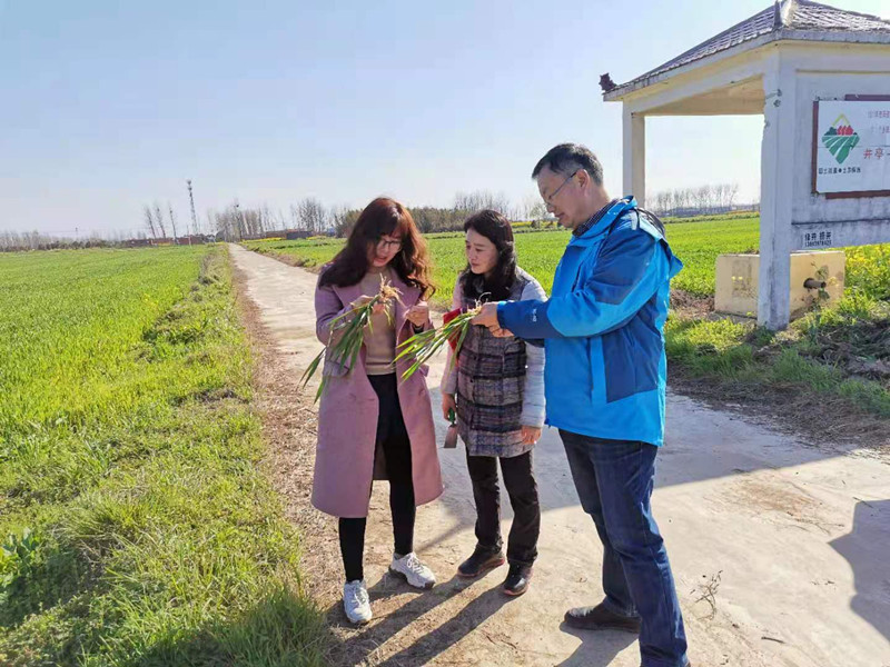 在潘滋亮副总的带领下参观了宏升公司的弱筋小麦种植基地,调查了郑麦819,郑麦817,郑麦518,杨麦113,杨麦13,杨麦30的生长情况和病虫害的发生情况,同时调查了有机弱筋小麦的种植模式,深入田间调查了有机种植弱筋小麦的长势,对比了有机种植弱筋小麦与常规种植小麦的长势差别,并与潘总交流了如何优化栽培管理模式、养分管理措施以及病虫害的绿色防控措施,提高弱筋小麦的产量和品质,同时,孙君艳向企业负责人保证,加强校企合作,促进乡村振兴,服务团将与企业共克弱筋小麦生产过程中的技术难题,加强技术联系,为宏升企业打造高标准弱筋小麦生产基地积极提供技术服务。