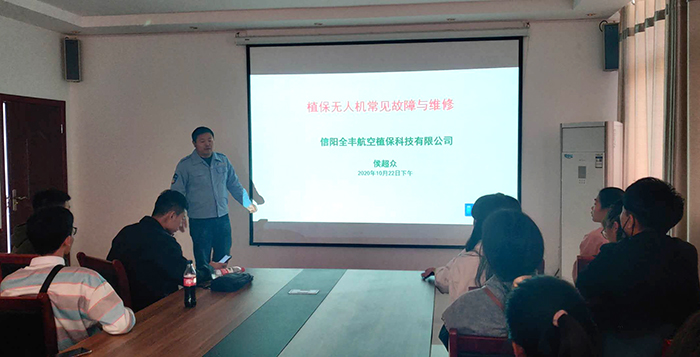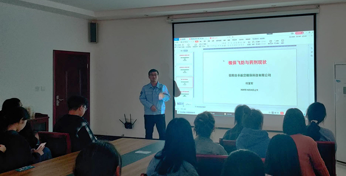 信阳全丰航空植保科技有限公司作为河南省大学生校外实践教育基地,为植物保护专业应用型本科人才培养提供实践教学平台,公司总经理付亚军、生产车间主任胡静伟、售后服务部主任候超众、办公室主任汪静分别为学生作了《植保飞防与药剂现状》、《多旋翼植保无人机使用与维护》、《植保无人机常见故障与维修》和《豫南小麦主要病虫害发生规律与“一喷三防”》报告,并在报告后指导学生进行了动手实操。