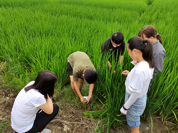 随后,副校长黄松,农学院尹院长、李书记等看望慰问了暑期实践的5名学生,鼓励他们在实践期间发扬不怕苦不怕累的精神,展现信农学子的风貌,认认真真做好试验工作。黄校长勉励校水稻研究所团队成员,要多向兄弟院校学习,发挥自身优势,争取在科研项目上有更进一步的深入合作。王付娟、董丽平、季新和周强老师详细询问了学院学生暑期开展科研实践和生活情况,查看了其在水稻田中收集伤流液的操作演示,并强调学生实习期间注意安全事项,尤其天气炎热,预防中暑。