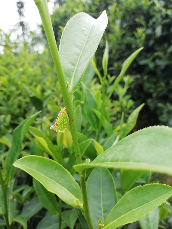 在调查中发现,茶园中蜡蝉成虫处于盛发期,目前茶园中主要有柿广翅蜡蝉、八点广翅蜡蝉、圆纹广翅蜡蝉、透明疏广蜡蝉、褐缘蛾蜡蝉和碧蛾蜡蝉等常见种类,并拍摄了一些蜡蝉成虫和若虫的生态图片,黄板上也诱集到了较多蜡蝉成虫,并带回实验室内统计数量。调查中还发现柿广翅蜡蝉产卵对油茶枝条为害较重,灰茶尺蠖的第四代成虫开始出现。受上几周的持续降雨影响,第二代茶毛虫发生量很少,基本不会对茶树构成危害。在申林茶园,因为上周采取了有效的防治措施,灰茶尺蠖幼虫危害情况已经明显减轻,部分茶树上可见到幼虫尸体。在亿峰茶园,上周喷洒了植物源农药苦参碱,导致茶小绿叶蝉、茶蚜等刺吸类害虫发生量减少。