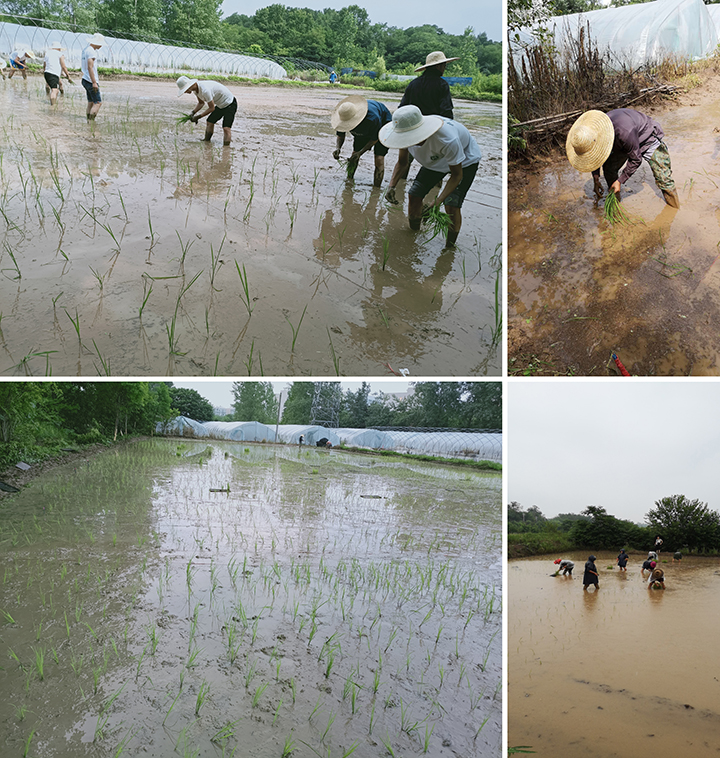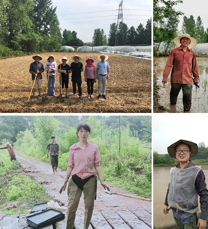 7月1日-5日,在太阳坡实习基地和三桥试验地的水田,始终能看到水稻研究所人员忙碌的插秧身影。连日来,信阳地区始终阴雨绵绵,为了不耽误水稻的移栽,从早晨天蒙蒙亮,到傍晚太阳落山,他们头戴草帽,身披塑料布,在大雨中坚持插秧。虽然汗水混合着雨水湿透了衣衫,但是望着秧苗一棵棵插入稻田中,他们的干劲更足了。一张张满头大汗的面庞,一个个田间忙碌的身影,一身身泥土气息的衣衫,这正是信农科研工作者最真实最朴素的写照。