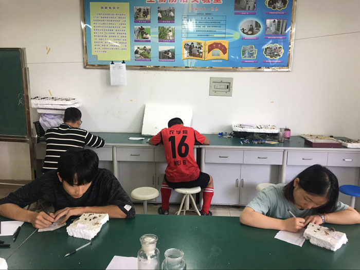 按照《普通昆虫学II》的教学安排,我院2016级植物保护专业于2018年6月19-23日开展了课程教学实习。本次教学实习主要分为野外实践和室内实践两部分。主要实习内容包括了解采集昆虫标本的工具分类和使用方法,指导学生野外采集昆虫标本的基本方法,不同类型针插昆虫标本的制作方法,浸渍标本的保存方法及昆虫标本的鉴定等。