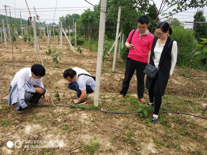 在光山县天丰农业专业合作社,科技服务团队就葡萄花果管理技术提出建设性意见,演示了科学有效的疏花疏果技术;就梨园梨木虱发生严重的问题,提出了绿色防控综合防治策略;就猕猴桃园病毒病发生严重问题,建议立即拔除已感染病毒病的猕猴桃植株,防止病毒病在猕猴桃园扩散蔓延,同时加强传毒害虫叶蝉的防治。