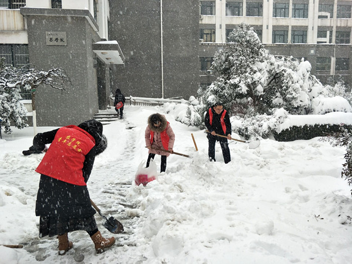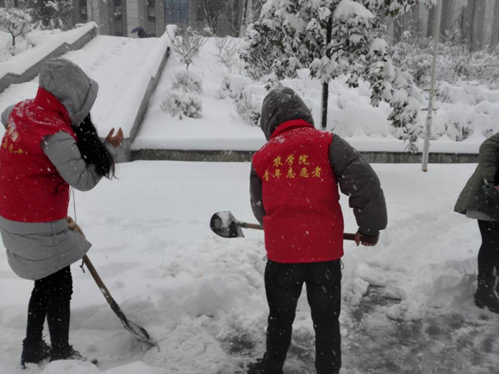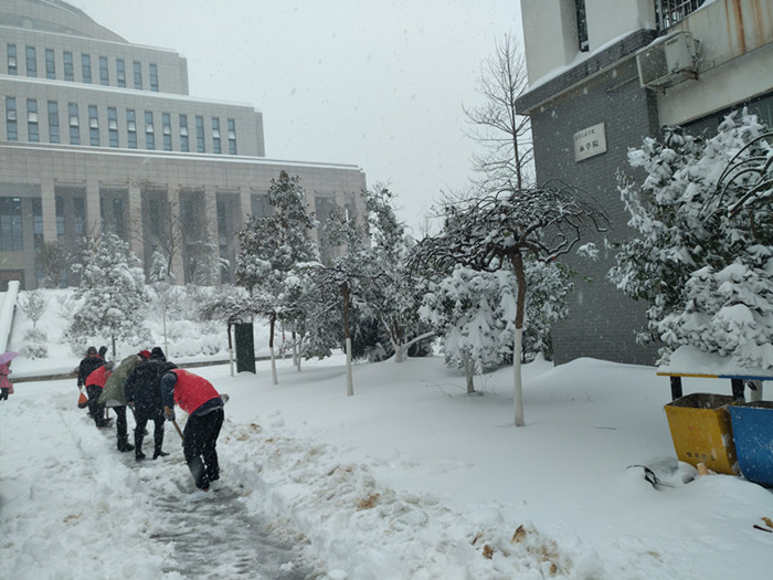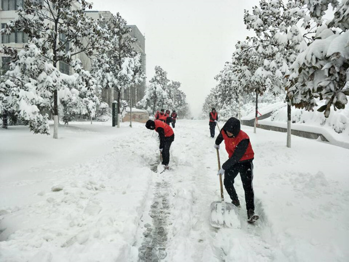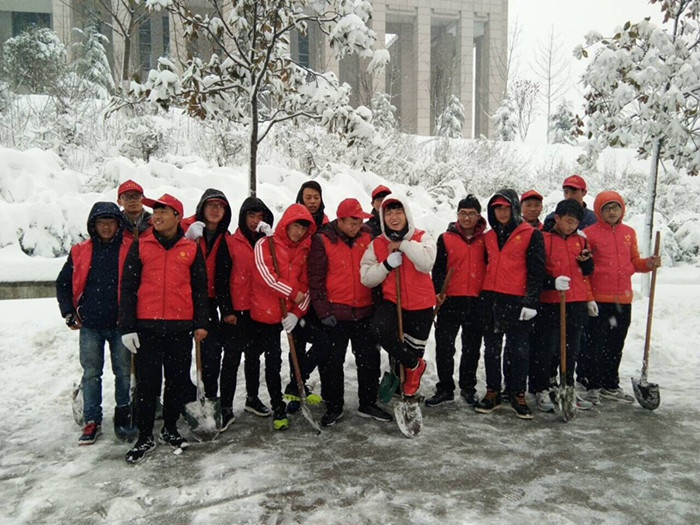 今冬的第一场雪比往年来的都要猛烈。一夜过后,雪堆积成厚厚的一层,道路突然消失了,师生出行极为不便。厚厚的积雪也让门前的树都弯下了腰,折断了枝干。2018年1月4日一大早,院长尹健带队,我院师生自发组成志愿服务队,进行2A实验楼周边路面积雪清理和树枝除雪。