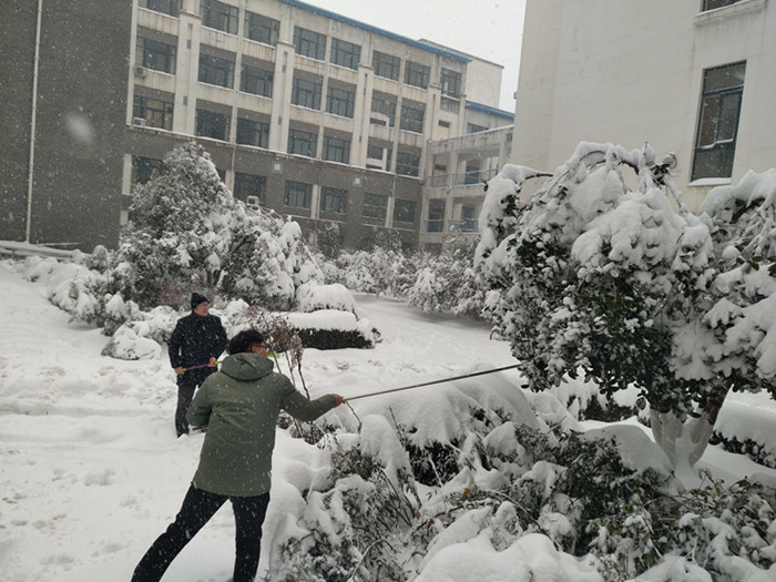 师生们不畏严寒,干得热火朝天。尹院长拿起长竹竿,带领几位青年老师一起清理树枝积雪,保护树木枝干。还有一些老师带领学生们拿起铁锨道路除雪,积极配合,一起奋战,热情感染了每一位路过的师生。经过两个小时左右的劳动,周边的树木得以“直起腰”,一条通向主干道的道路变得“清晰”起来。