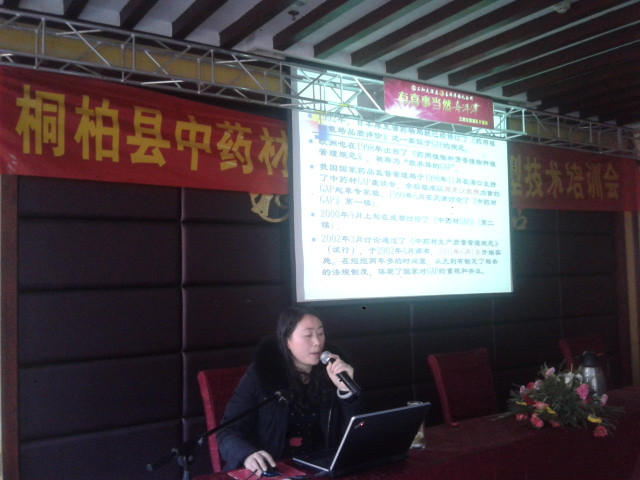 此次中药材发展研讨会为桐柏县农业局组织,参加人员主要由桐柏县中药材种植大户、经济作物种植技术骨干组成。农业科学系两位专业教师就桐柏县目前主要种植的中药材发展现状进行研讨,并对参会人员进行了为期2天的技术培训,分别从中药材发展现状及存在的问题;中药材GAP标准化种植技术;桔梗、菊花、金银花、丹参、夏枯草等常见中药材的栽培加工技术等方面向参会人员进行了认真的培训,为该县发展中药材生产提供了更好的服务。