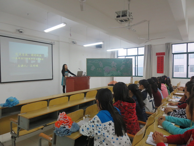 首先,王老师对来自各地的女同学表示热烈的欢迎,接着从“四自的提出”、“四自的内容”以及如何树立正确的恋爱观三方面开始,引导全体女生要自尊自信不要自卑,坚定信念,树立独立意识。旁征博引,从古到今一些成功女性的优秀事迹,同时列举了韩国,美国,日本等国外青少年自立自强的事迹,引导学生走向自立,告别依赖。随后王老师认真地讲解了如何培养正确的恋爱观,为同学们指引正确的恋爱道路;最后,王老师以大学生应学会的24件事结尾,从学习,生活,社交,就业等方面详细介绍了大学生活,希望大家做一个阳光,有气质的幸福女孩,讲座在轻松活跃的气氛中圆满结束。