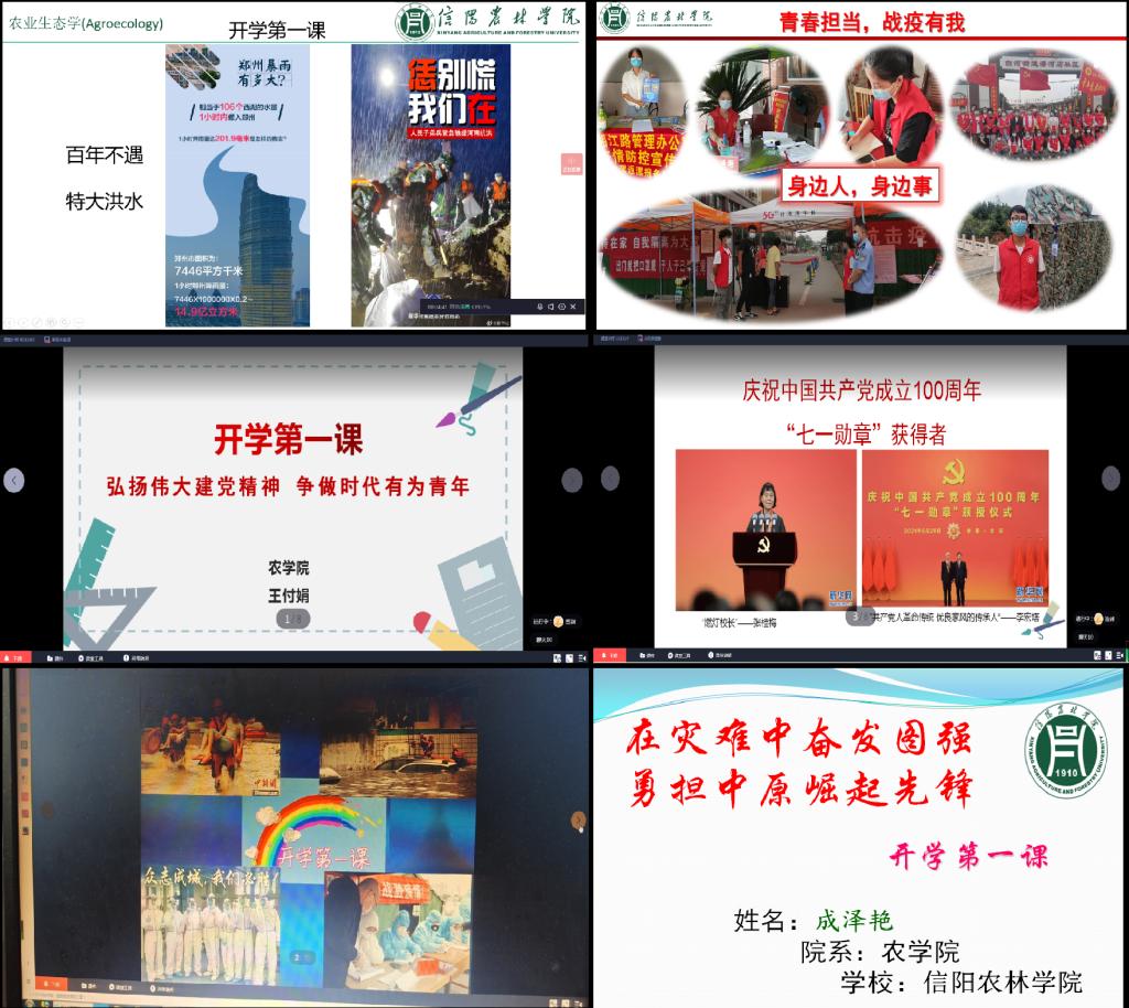 各任课教师开学第一课的主题形式多样,内容丰富,聚焦庆祝建党百年、时代楷模、抗疫先进人物、“志愿服务,青春担当”、把灾难当教材,与祖国共成长等主题。通过回顾中国共产党的辉煌历史,让同学们感受到中国共产党百年的风雨历程,借助中国共产党的发展史来激励同学们不负时代韶华,汲取智慧力量,认真学习专业知识,铭记党的光辉历史,为中华民族的伟大复兴而不懈奋斗,争做时代有为青年。面对暴雨洪水和疫情肆意,一个一个最美逆行者的伟岸身影又让我们看到了中华儿女的守望相助。通过该主题讲述,引导同学们在面临风险和挑战时,要提高政治站位,增强忧患意识,把灾难当教材,吸取经验和教训,与祖国共进步,同奋进,鼓励同学们承担起当代大学生的使命和担当,让青春在奋斗担当中绽放。