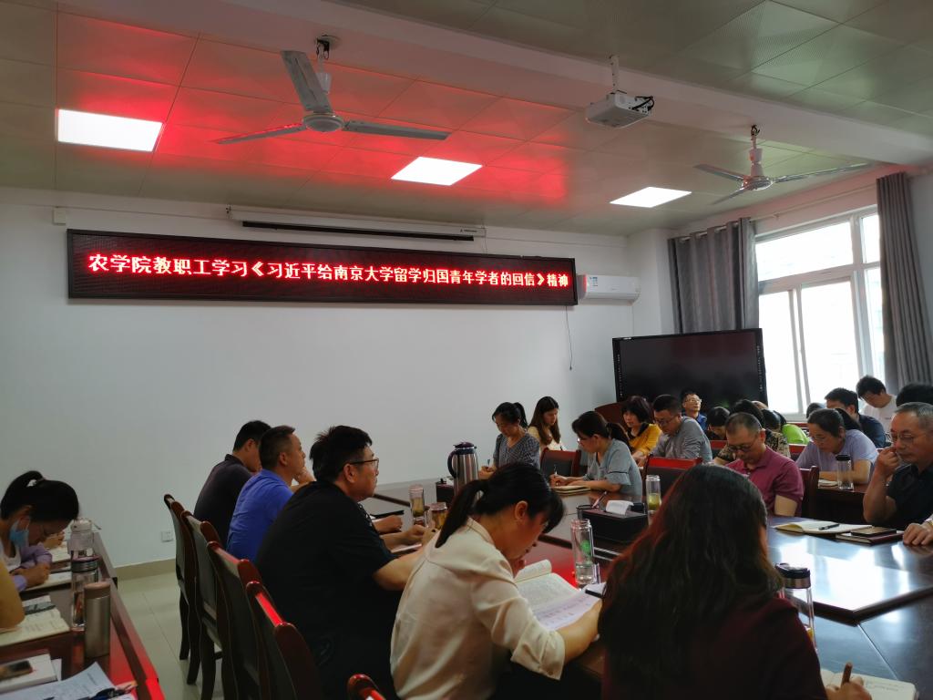 农学院党总支在2022年5月31日下午召开全体教职工会议,学院党总支书记李传保首先带领大家认真学习领会《习近平给南京大学留学归国青年学者的回信》精神,并要求每个教研室派一名教师代表发表感想,我院有4名老师积极发言。