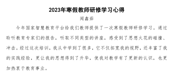 此次“寒假教师研修”活动对于教师的成长具有十分重要的意义,让教师们足不出户即可充电赋能,学习领会党的二十大精神,提高专业水平,提升幸福感。我院教师专注聆听专家讲座,撰写学习心得体会,使丰富的研修课程内容入脑入心,有力地提升了综合育人能力。