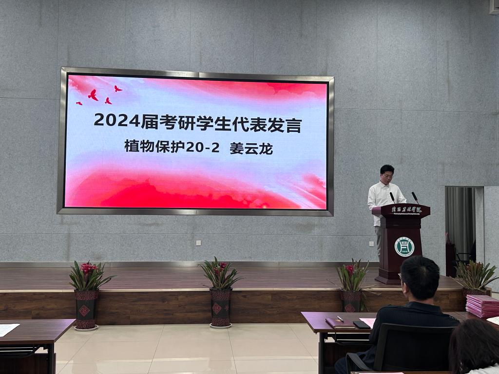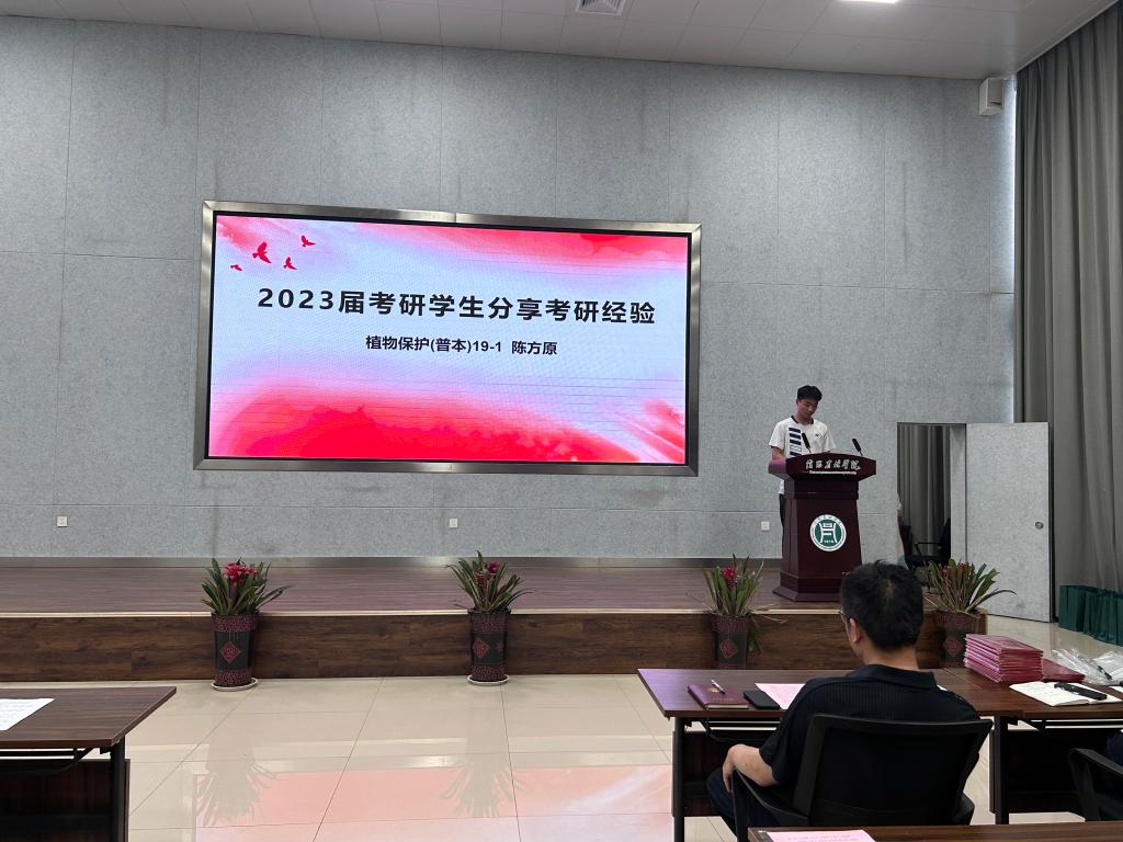 种子科学(普本)19-1班张园园、植物保护(普本)19-1班陈方原作为考研优秀代表依次发言。他们从总结学习方法、择校策略及找好研友等方面分享考研经验,并鼓励学弟学妹们明确目标、积极备考、合理规划复习时间,努力取得优异成绩。植物保护20-2班姜云龙作为2024届考研学生代表发言,他表示已决心考研,脚踏实地,坚持不懈,争取实现精彩人生。郭世保和季新老师作为2019级辅导员代表发言,他们对2023届考研录取的同学表示衷心祝贺,并鼓励2024届考研同学要做好学习规划,在考研征途中辛勤耕耘、踔厉奋发、成就梦想。
