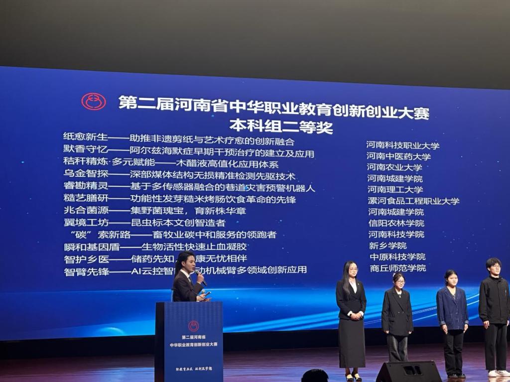 11月7日,由中共河南省委统战部指导,河南中华职业教育社、河南省教育厅、河南省人社厅联合主办的第二届河南省中华职业教育创新创业大赛在周口市圆满闭幕。我院乔利、陈磊老师指导,本科生王荣凯、张岚斐、张俪凡等参与的项目《翼境工坊——昆虫标本文创智造者》斩获二等奖。