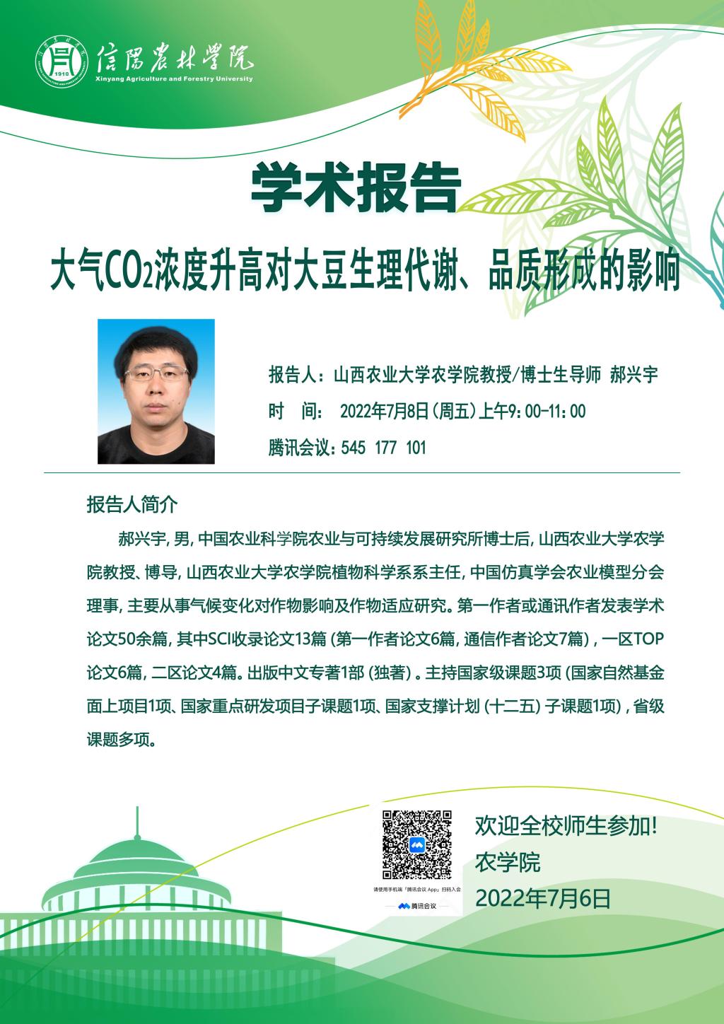“瀹斋论道”第3期学术报告:大气CO2浓度升高对大豆生理代谢、品质形成的影响