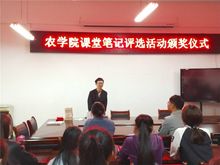 23日晚,在农学院会议室2A316举行了了优秀笔记评选活动颁奖仪式。学工组老师徐运飞、刘书含,学习部部长唐广耀以及优秀笔记获奖的学生们参加了此次仪式。仪式由学习部部长唐广耀主持。颁奖仪式上,刘书含老师提出笔记是上课认真听讲的一种表现,也是受益一生的一种习惯。徐老师指出在学习过程中,笔记比拍照对学习更有促进作用。同学们纷纷表示会端正学习态度,遵守课堂纪律,认真听讲做笔记。