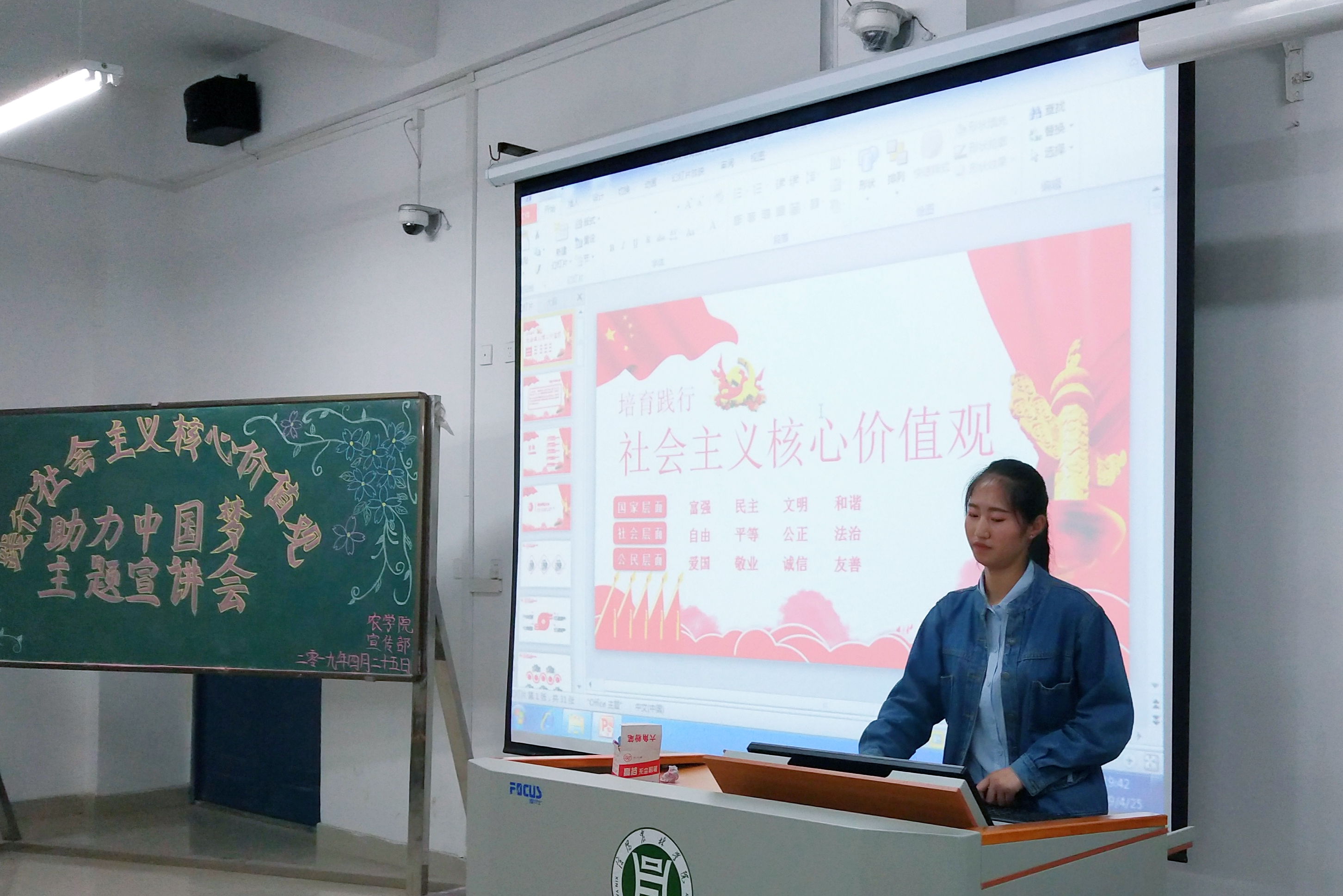 为了引导学生培养和践行社会主义核心价值观,加强学生的思想道德建设,2019年4月25日晚我院在二教304举办了“践行社会主义核心价值观”宣讲会。院宣传部组织参与了本次宣讲会。宣传部部长贾贤慧同学担任主持人,18级同学参加。