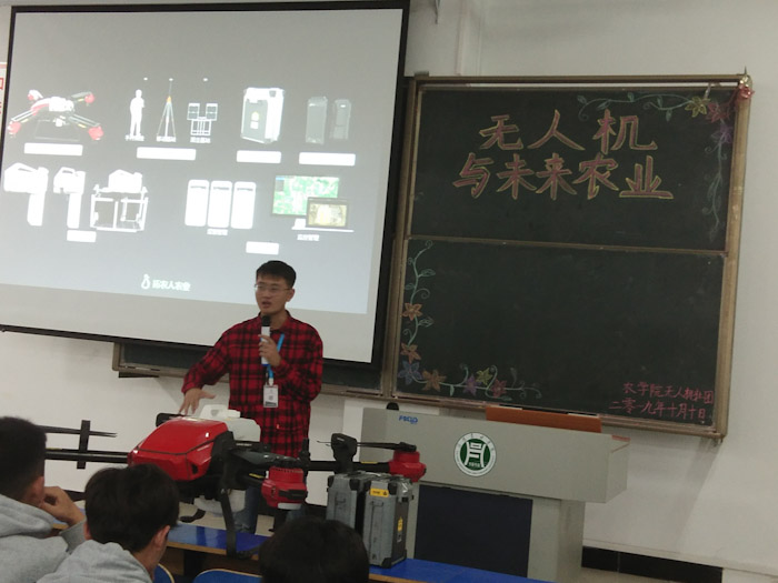 2019年10月10日晚,我院在一教E201举办以“无人机与未来农业”为主题的讲座,本次活动由无人机社团会长徐冰阳同学担任主持人,拓农人公司副总经理杨金鹏同学和杨晓峰同学担任主讲人,19级学生参与。