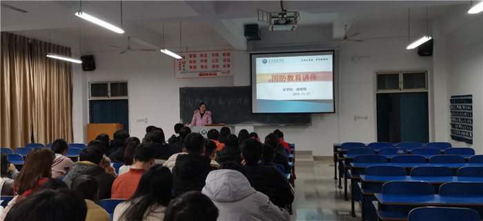 为普及国防知识,增加同学们爱国热情,2019年11月27日晚上,我院在一教A105举办了国防教育宣讲会,唐明明老师担任主讲人,18级同学参加。