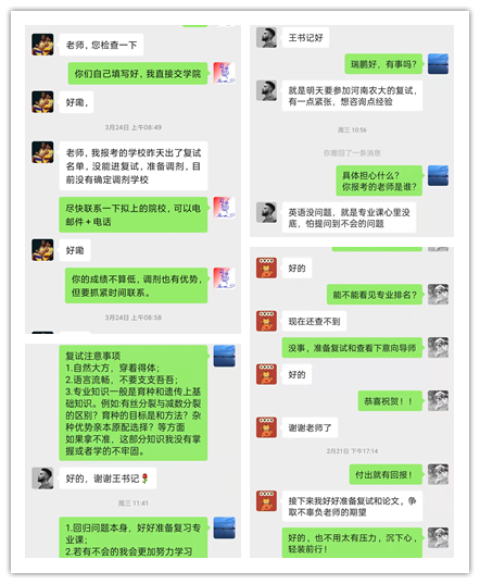 各毕业班辅导员对即将复试的考生进行“一对一”服务,及时提醒复试的考生们提前到场熟悉环境,调试设备,细心帮助考研学子完善材料撰写格式,随时为考生解决突发状况,全力做好服务工作。同时,结合学生考研分数情况,扎实开展考研复试指导,做好后续就业指导和帮扶工作。