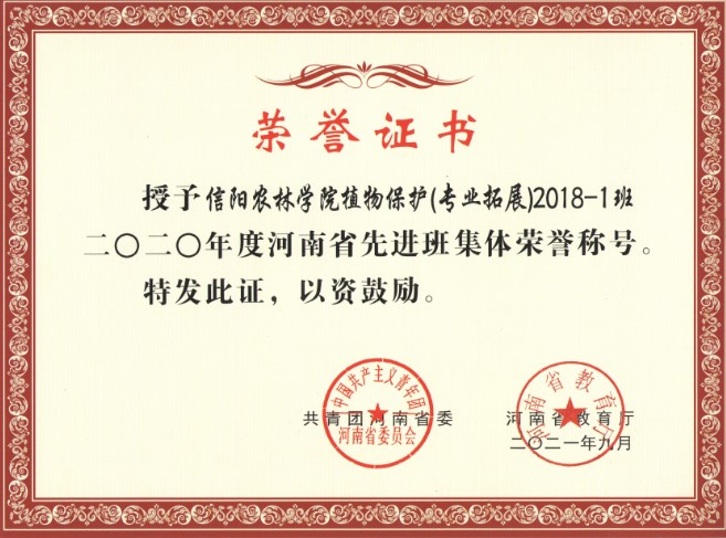 植保2018-1班是一个充满朝气的班集体,无论是思想政治建设,班风学风建设,还是实践活动等方面,都取得了优异的成绩,该班曾获得了2020年省级“先进班集体”荣誉称号。